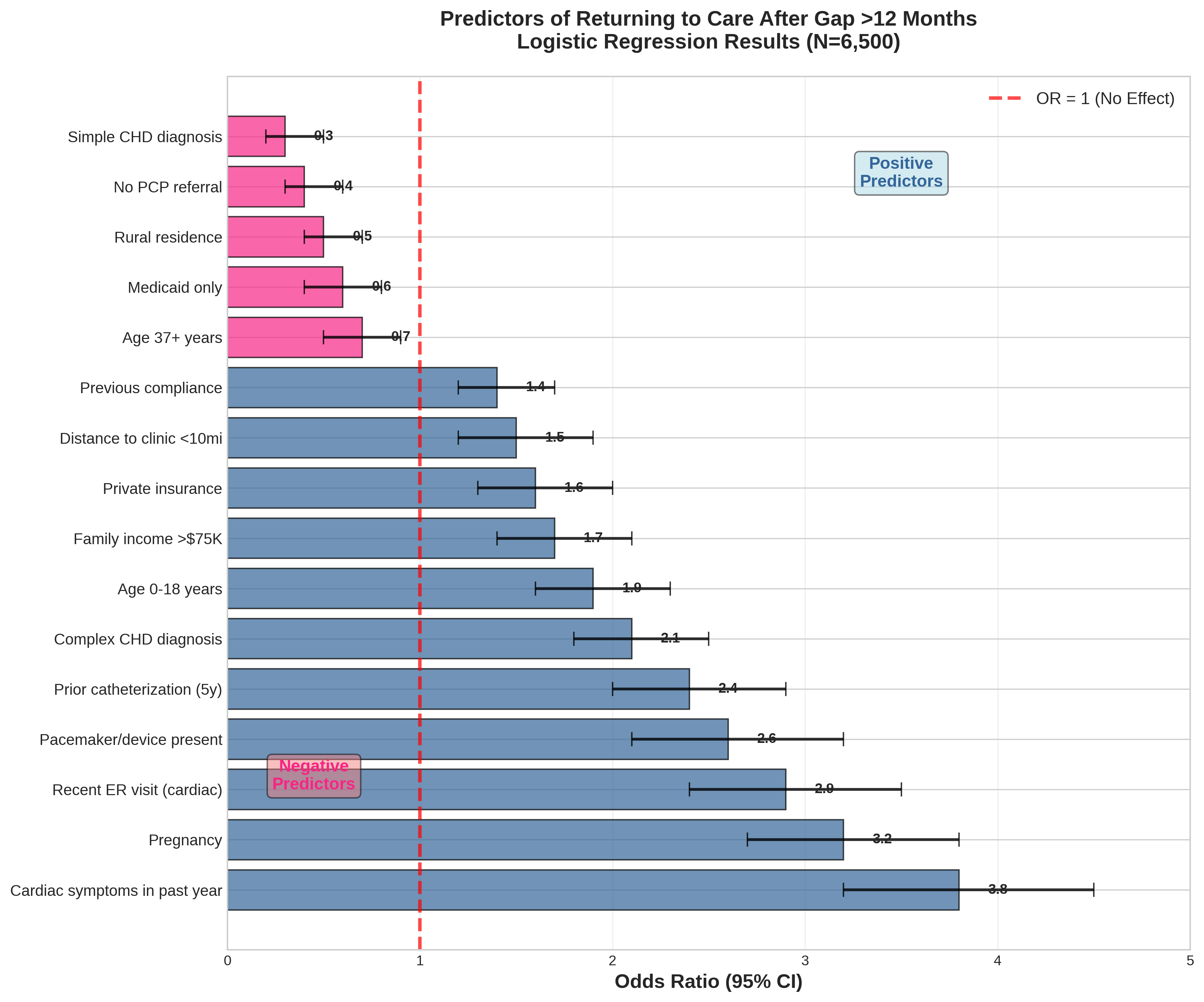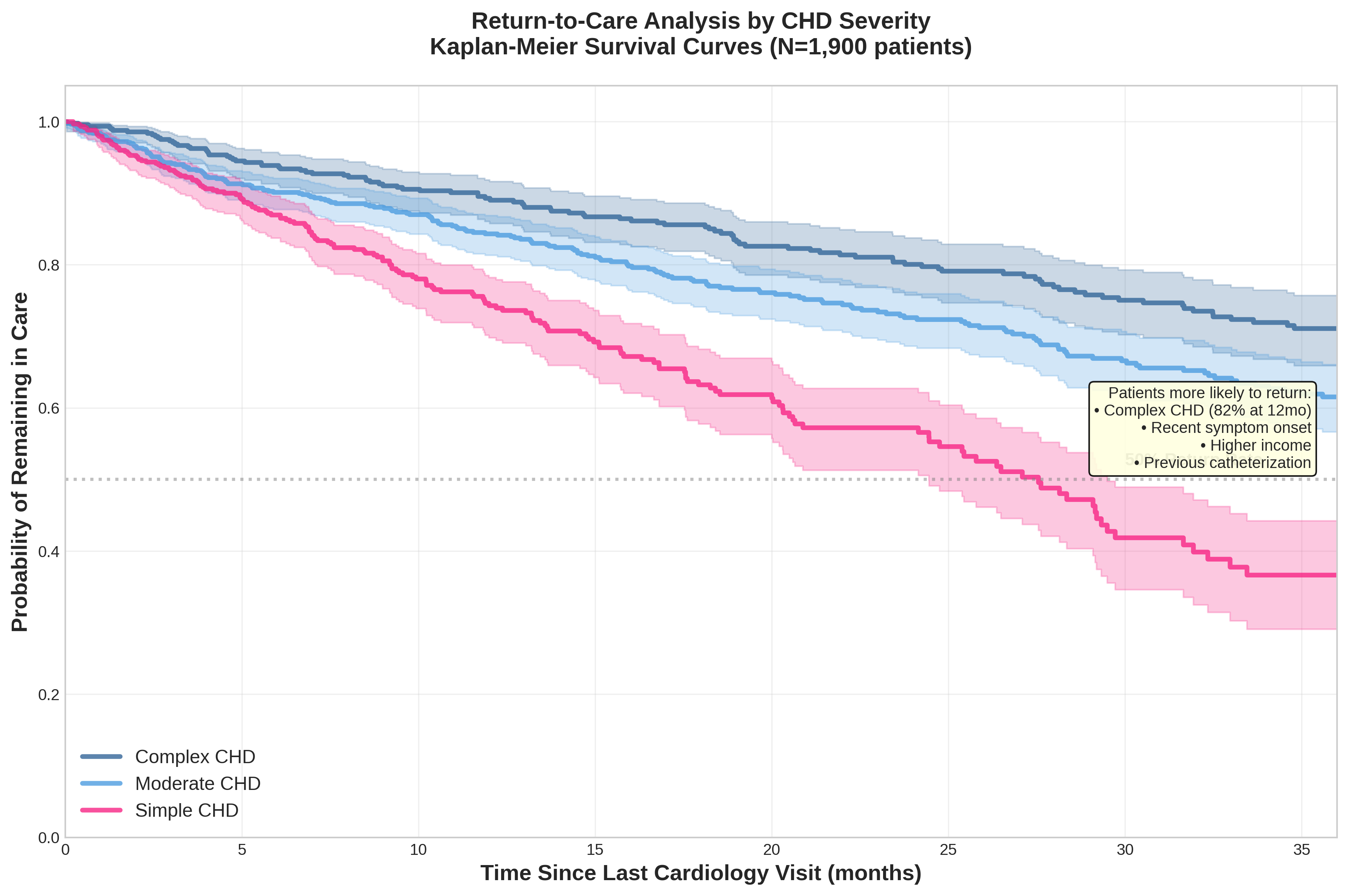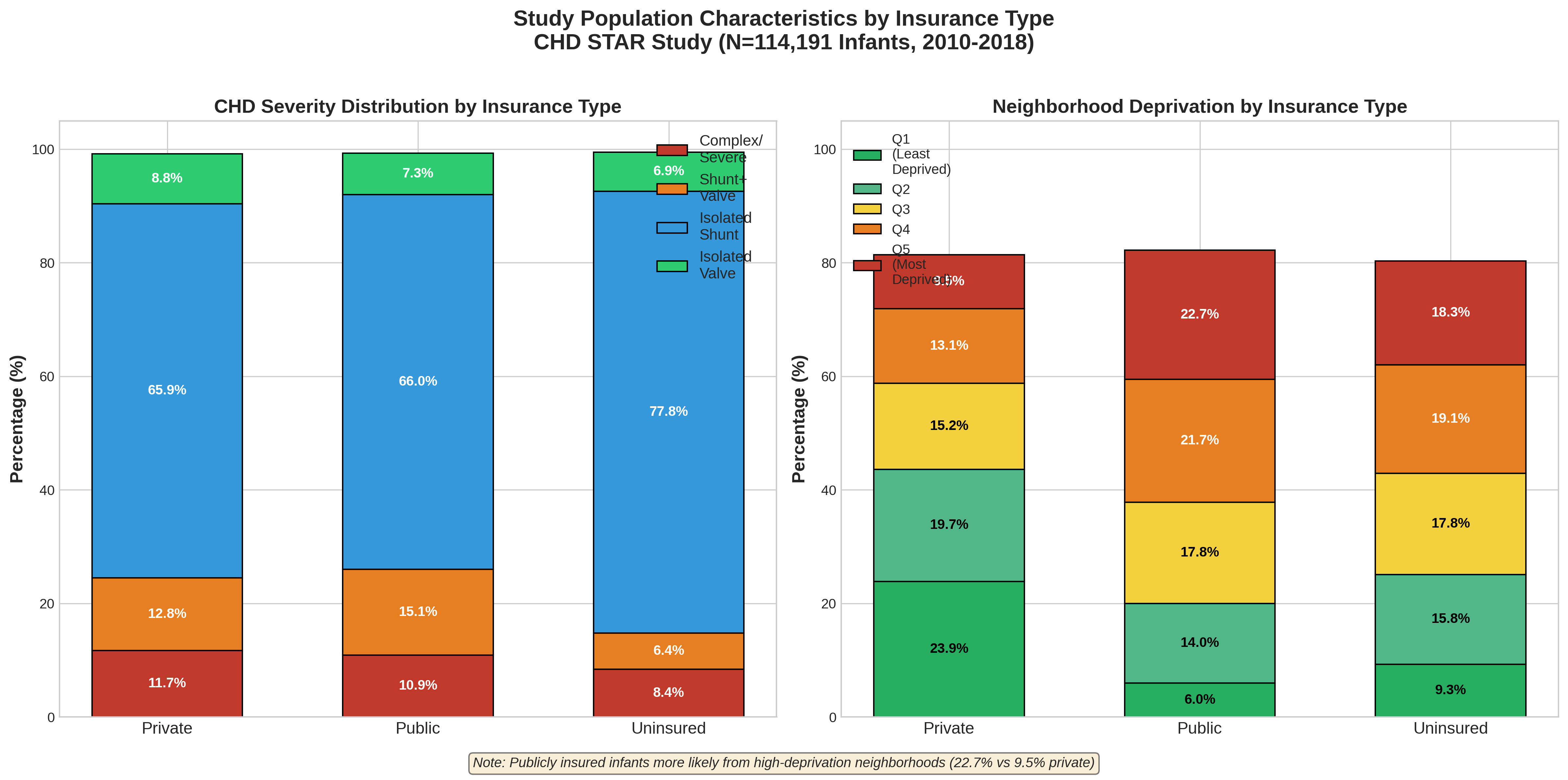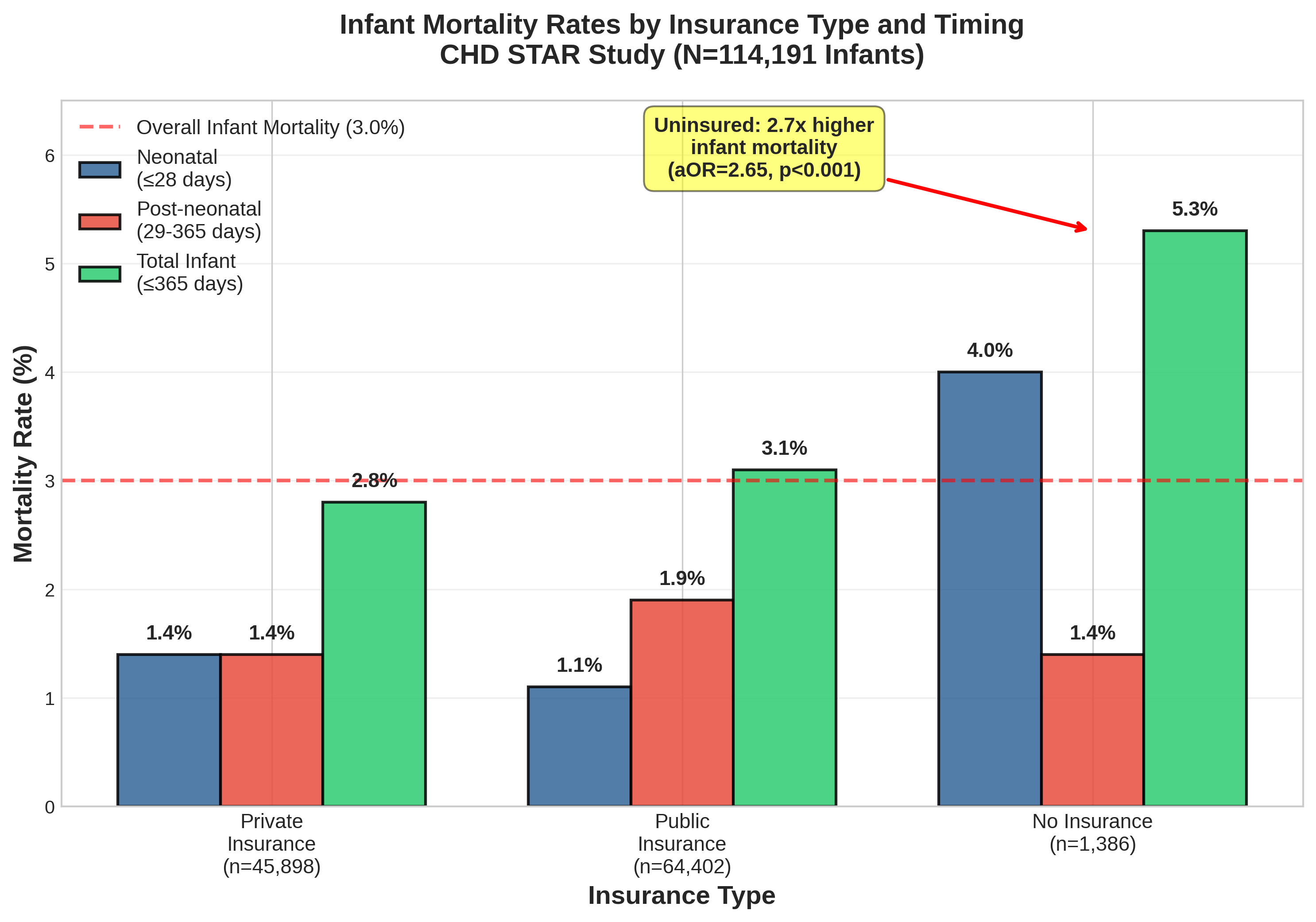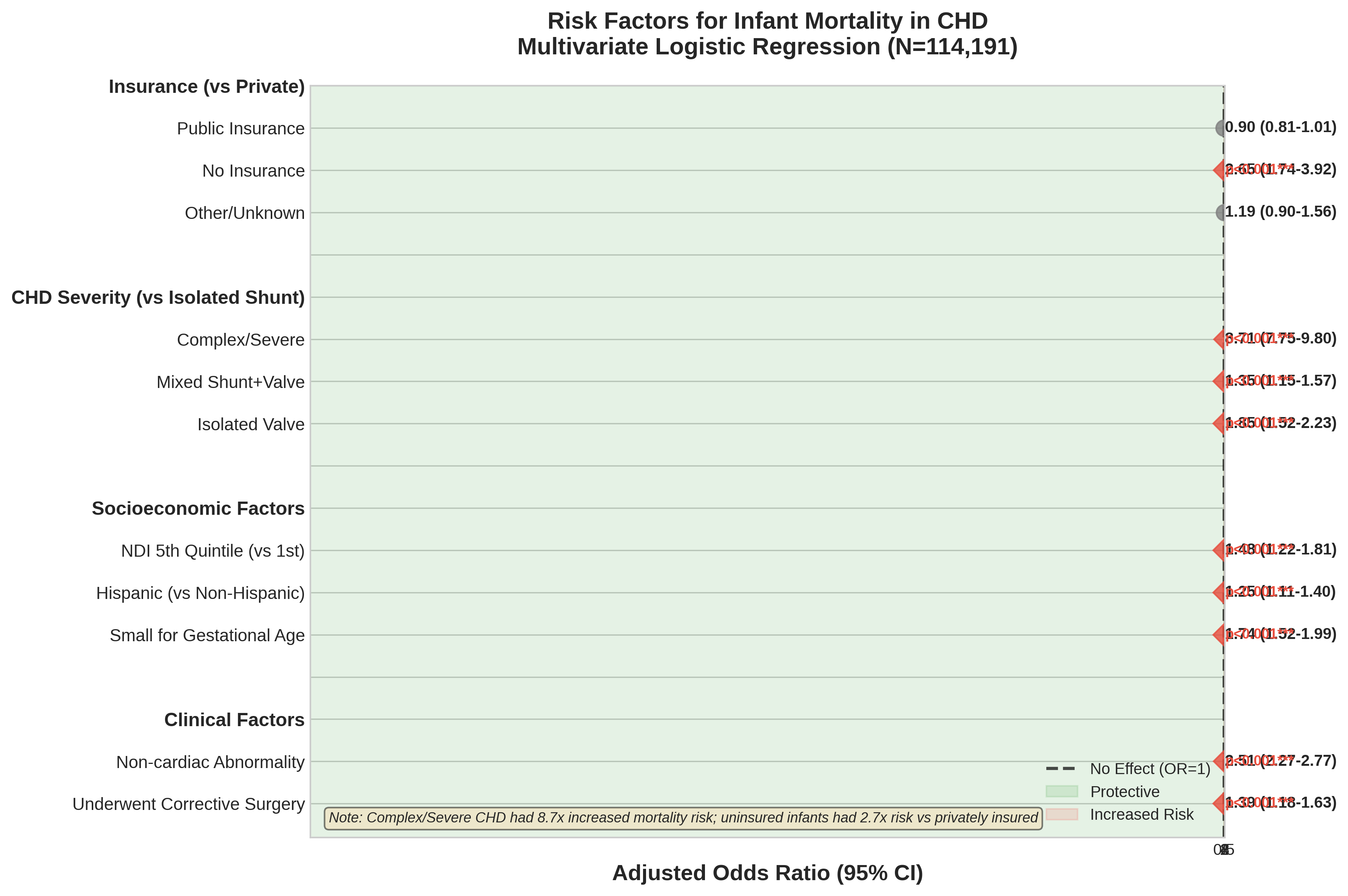 - Applied multivariate logistic regression adjusting for confounders (CHD severity, socioeconomic status, geography, clinical factors) to reveal that uninsured infants had 2.65x increased odds of infant mortality (95% CI: 1.74-3.92, p < 0.001) compared to privately insured infants
