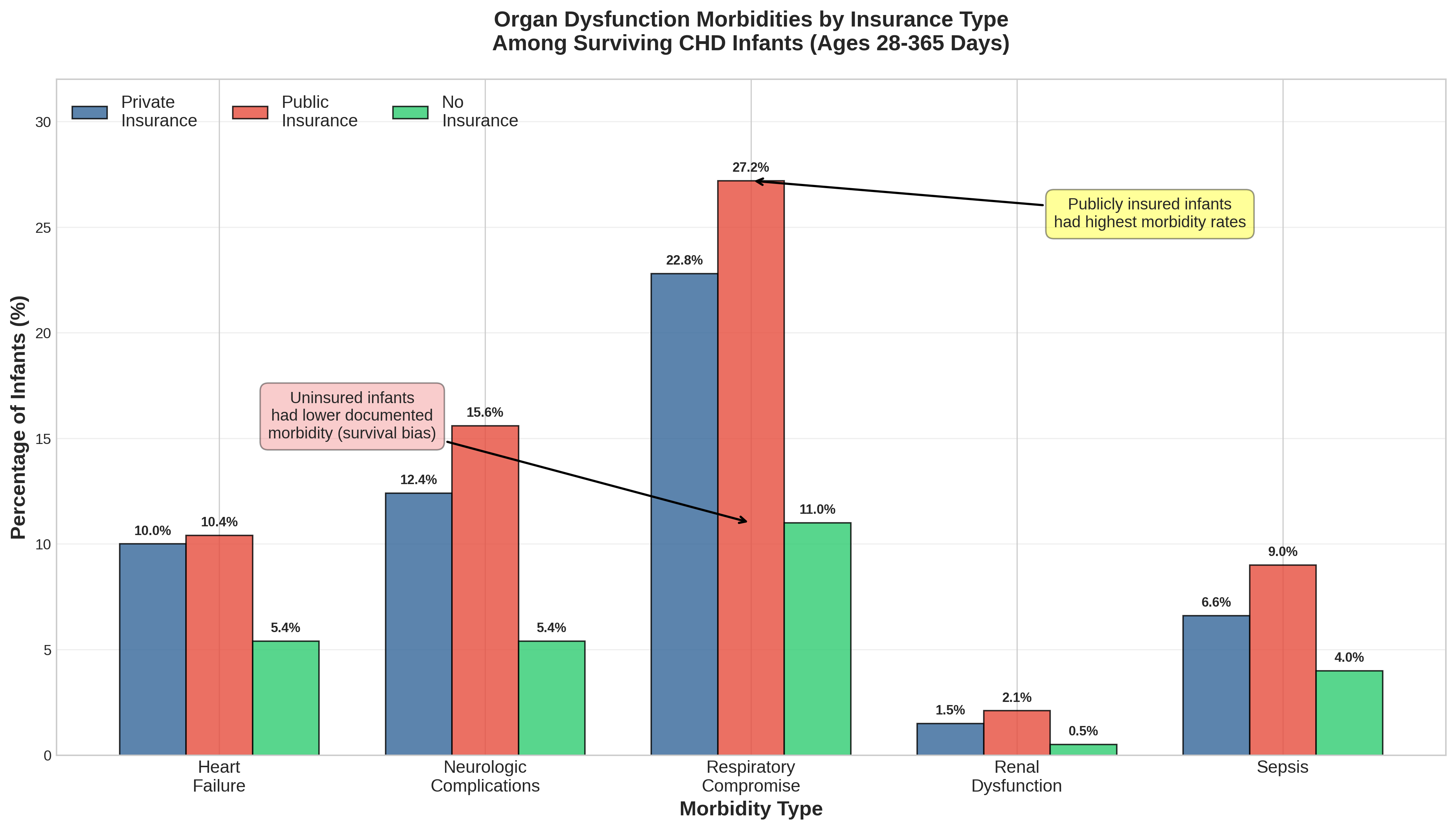 - Identified critical disparities showing publicly insured infants had 11-21% increased odds of organ dysfunction morbidities (neurologic, respiratory, sepsis) despite similar survival, while uninsured infants exhibited paradoxical survival bias with highest mortality but lowest documented morbidity rates