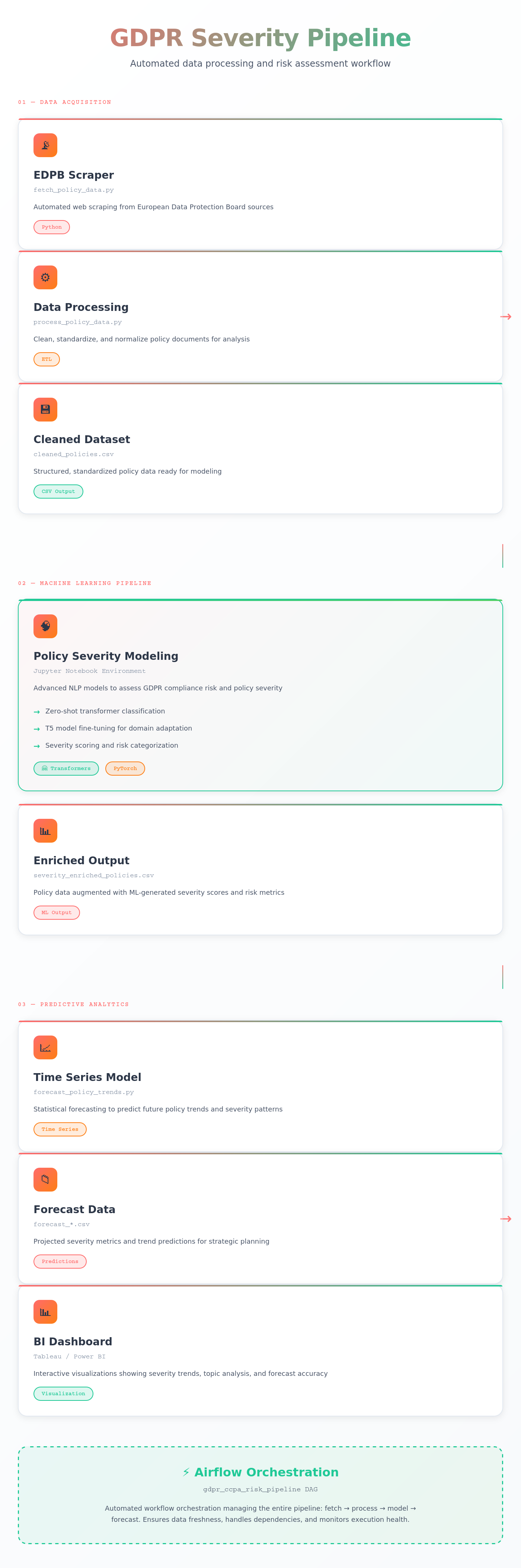 Automated daily ingestion of GDPR/CCPA updates into a governed dataset with model-driven risk signals for compliance teams.